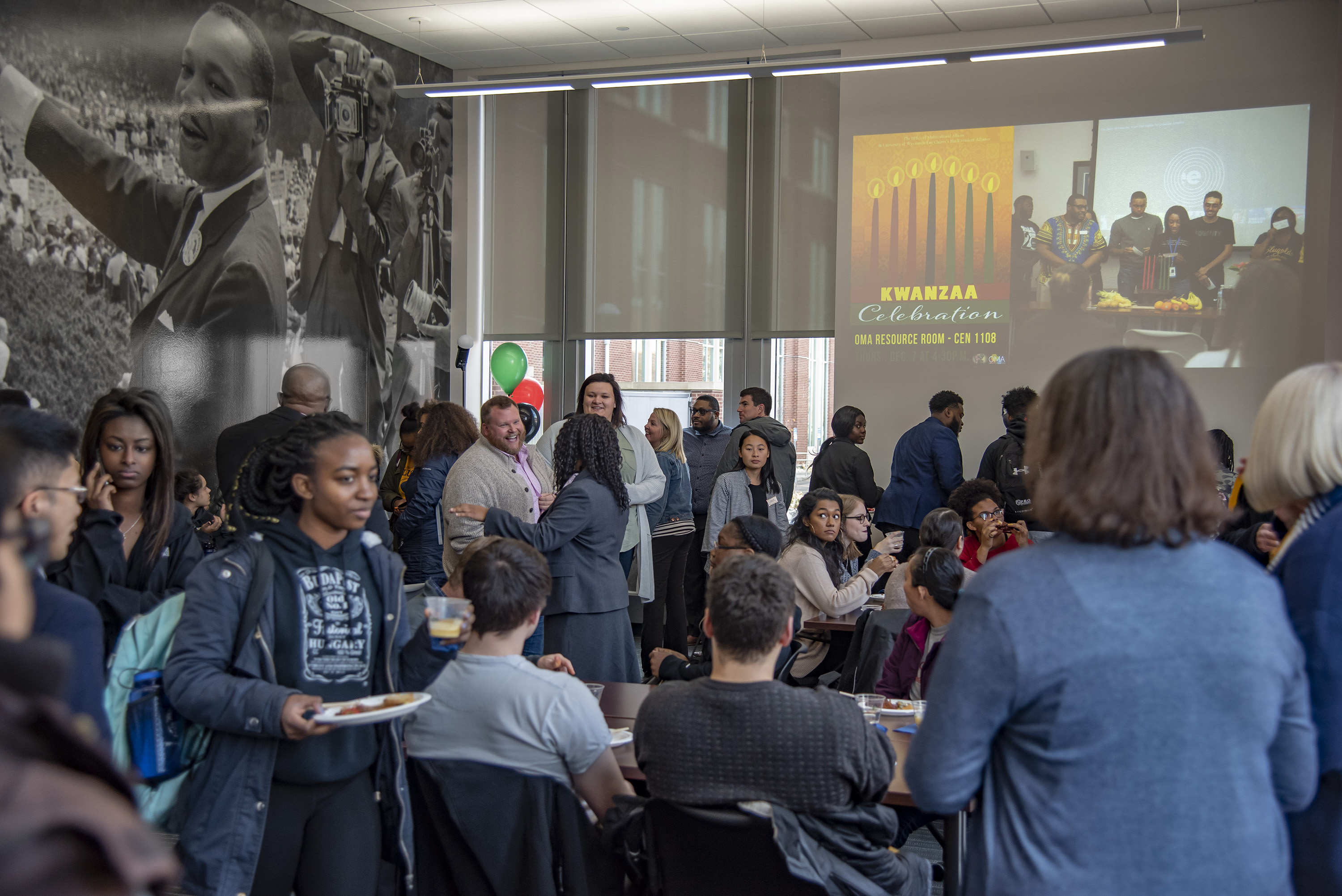 The new center will be the meeting place for black student organizations as well as an informal gathering and drop-in space. Located in Room 1931 of Centennial Hall, the space features moveable tables and chairs, a cork board, chalk wall, refrigerator, microwave, storage space and a screen projector. Covering an entire wall from floor to ceiling is a large image of Martin Luther King Jr. on the National Mall in Washington, D.C., after delivering his famous “I Have a Dream” speech on the steps of the Lincoln Memorial.