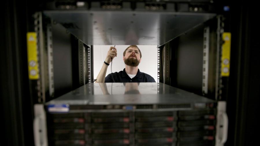 Photo of a student checking servers while working in UW-Stout’s cybersecurity labs. / UW-Stout
