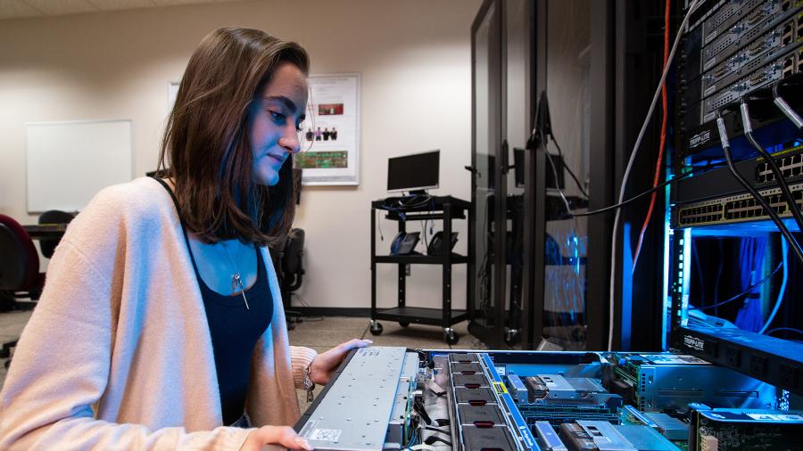 Photo of UW-Stout student Christina Kimball checking on equipment in a UW-Stout cybersecurity lab. / UW-Stout