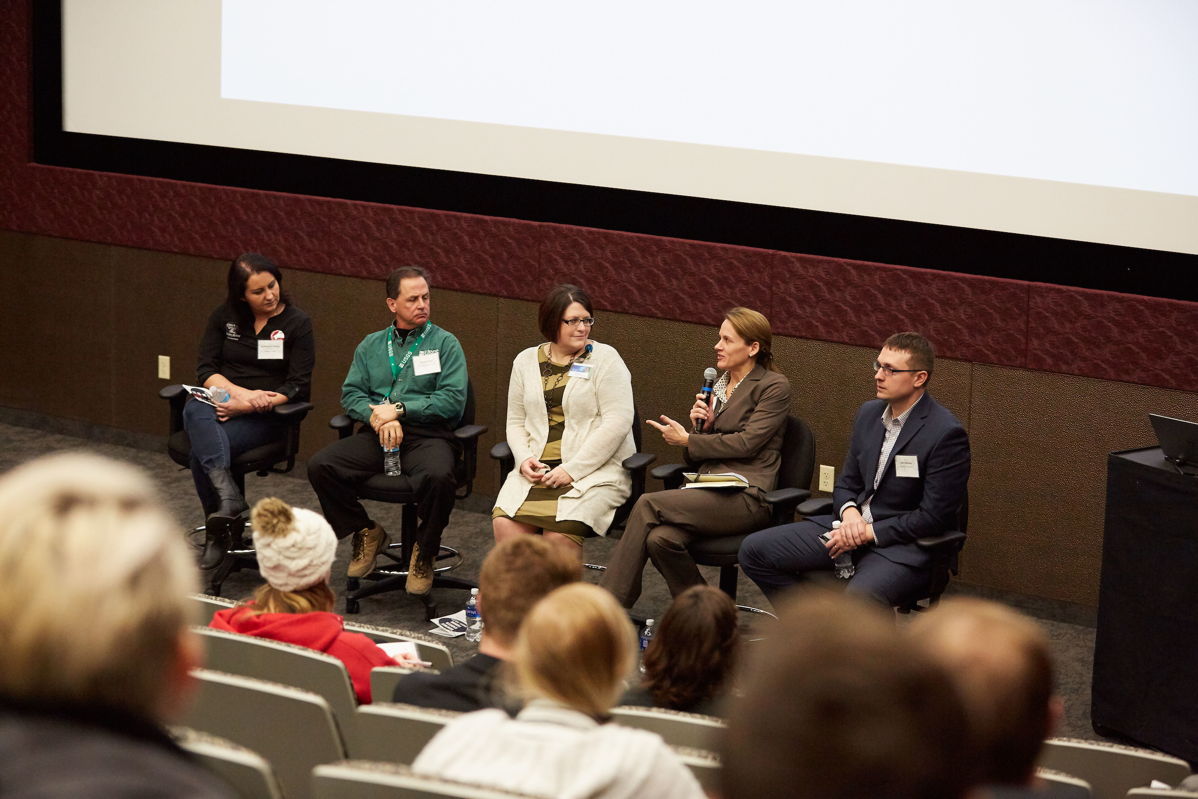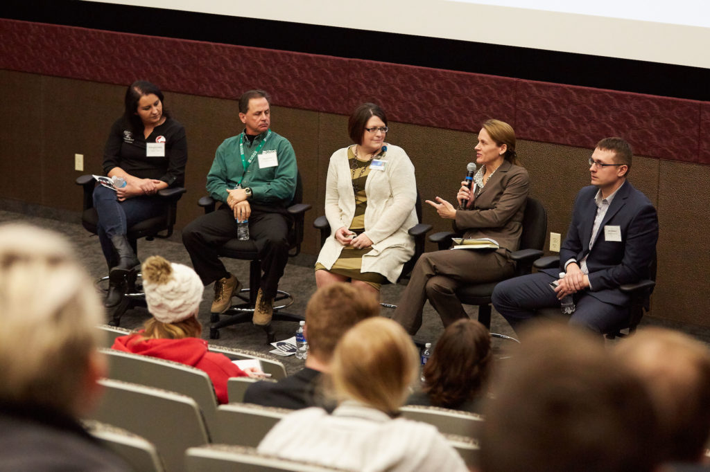 A panelist discussion about the science field was part of the third annual Science Career Forum on campus in February. The panel included, from left, Audreyona Chavez, Organic Valley; Randy Hines, U.S. Geological Survey; Lisa Becker, Mayo Clinic Department of Laboratory Medicine and Pathology; Donna Bossman, Ingersoll Rand – Trane; and John Bodnar, Aerotek Scientific.