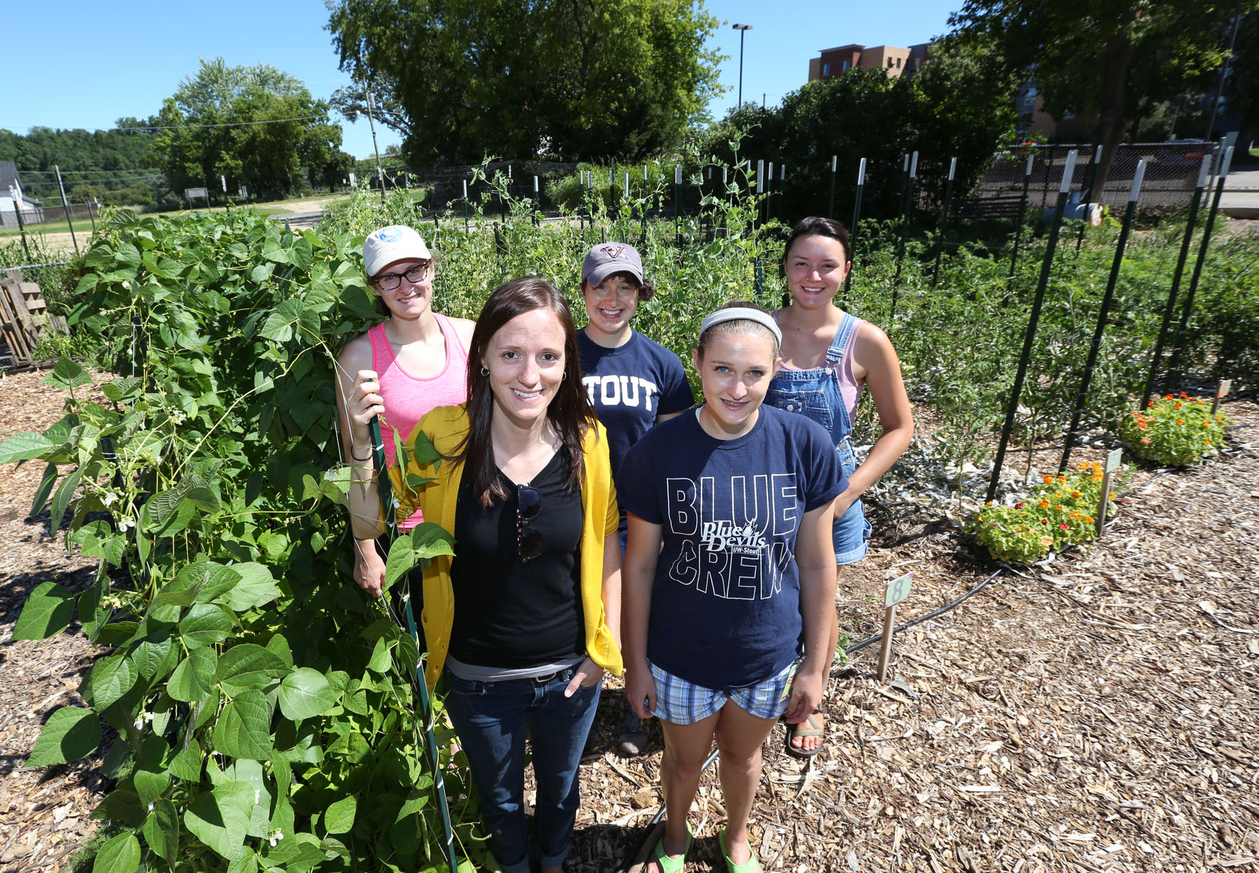 Menomonie, Wis. — On a recent summer morning, sun shining, University of Wisconsin-Stout students picked cucumbers, patty pan summer squash, dragon tongue bush beans, parsley and other items from a well-tended row garden on north campus.