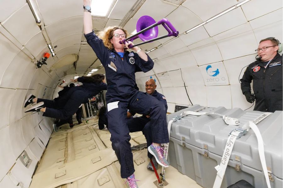 In 2022 Werner, who earned her B.M. in music education-instrumental at the University of Wisconsin-Whitewater in 2001, was one of four teachers in the country selected to fly microgravity experiments aboard a modified aircraft that creates periods of weightlessness. Werner’s experiments — performed in an aircraft NASA refers to as “g-force 1” with her signature purple trombone in hand — were designed to measure her ability to perform tasks such as keeping beat and responding to tempo signals in a weightless environment.