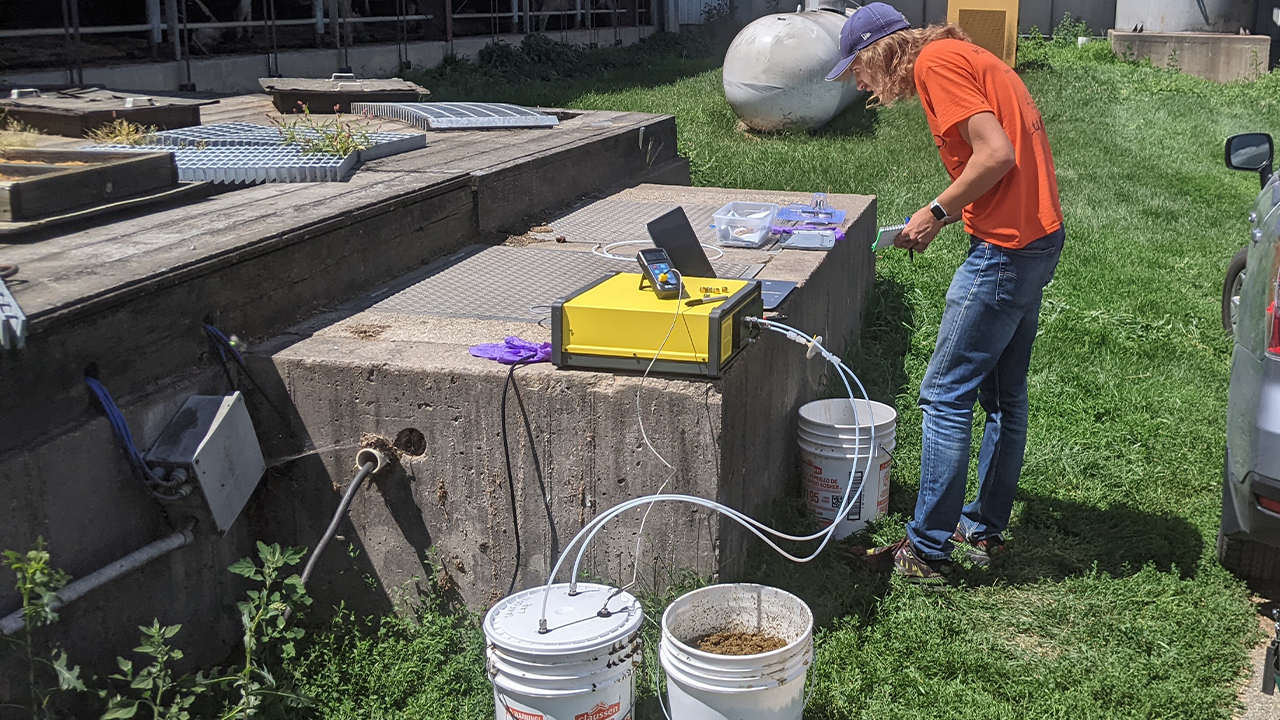 Smolinski, Flitsch and Dahl collected manure from Pioneer Farm and placed it in multiple five-gallon buckets at the farm. They left some of the buckets alone, similar to what happens at most manure storages. They added different types of biomass covers to the rest. In the first trial, the group used wood chips and corn stover as covers on some of the buckets, while others received biochar made out of wood chips or corn stover. For six months, they measured the gas emissions of carbon dioxide, methane, nitrous oxide and ammonia off the buckets once a week after they were filled and the covers were laid in order to determine the impact the covers had.