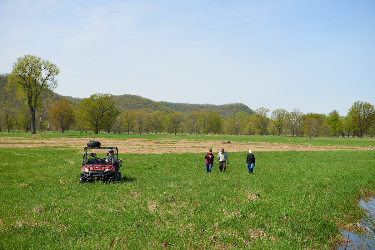 Thomsen walks with collaborators at a forest restoration site near La Crescent. A plant ecologist, Thomsen is interested in using her understanding of ecology to find the best ways to manage natural ecosystems. Results of her latest experiment will be shared with land management agencies to bring back floodplain forests, which are important habitat for wildlife and birds.