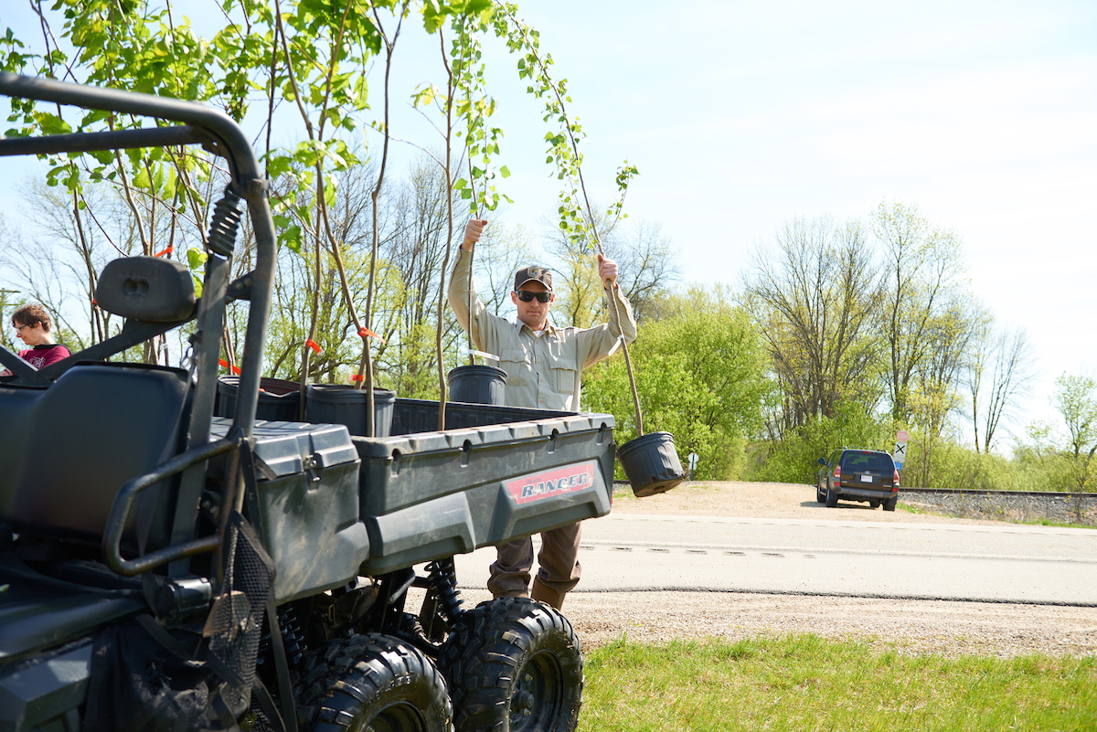 On a Wednesday morning, graduate student Kiser begins lifting trees onto an ATV to haul them to plots of land treated to reduce reed canary grass. The tree planting experiment will place several thousand trees in 64, one-half acre plots in southeastern Minnesota.