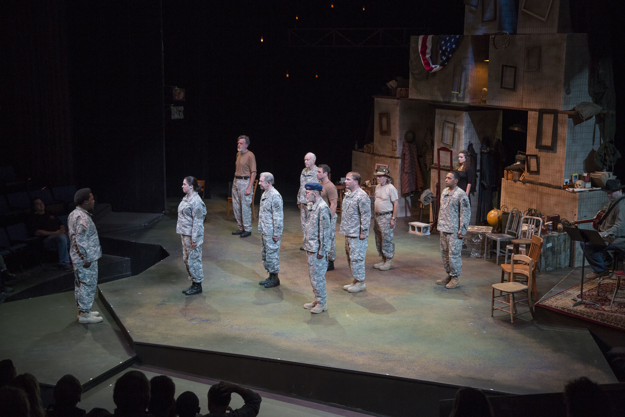 The interplay also allows the actors to connect with the kindred damaged spirit behind the mask. DiPietro says she feels more comfortable when acting with this crew of like-minded vets than she has anywhere in a long time. “In this group was the first time I told anyone that I had been raped, other than the military police. Before I even told my husband,” she says. “When you’re on that stage, all you have is each other.”