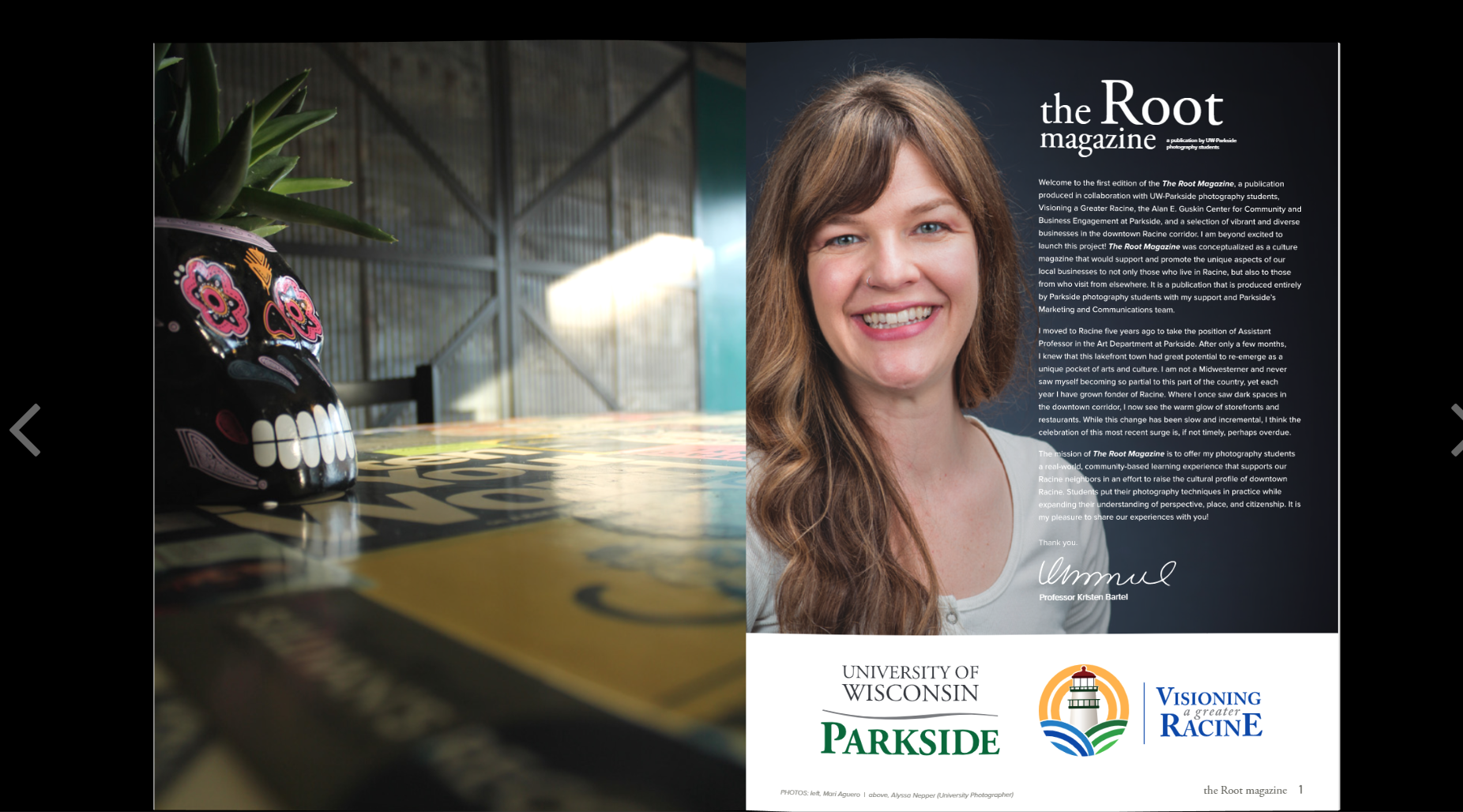 UW-Parkside students in Professor Kristen Bartel’s digital photography class recently partnered with downtown Racine businesses to create The Root Magazine. In the new publication, which is named after the city’s historic river, UW-Parkside photography students use their creativity to help showcase the unique aspects of local businesses. The nonprofit initiative Visioning a Greater Racine invested financial support for both the design and printing of the magazine. Check it out online!