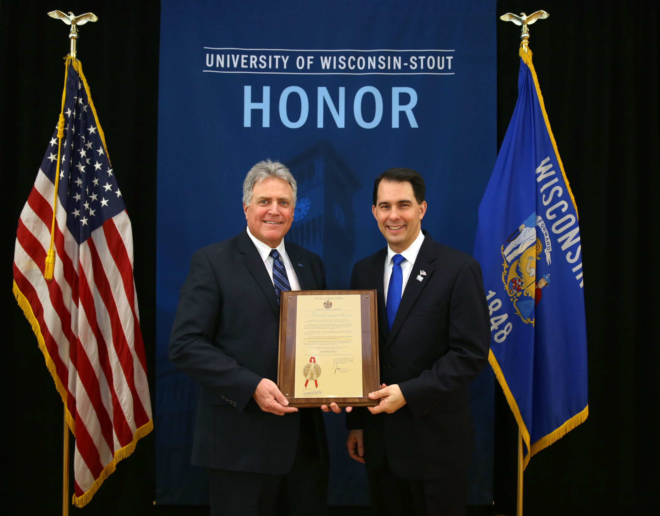Meyer was presented with the UW-Stout Day in Wisconsin proclamation by Walker at the end of the ceremony. It said in part: “UW-Stout has been transformed into a modern university with innovative undergraduate and graduate programs, but it has remained true to the original mission set forth by James Huff Stout of ‘learning through involvement.’ ”