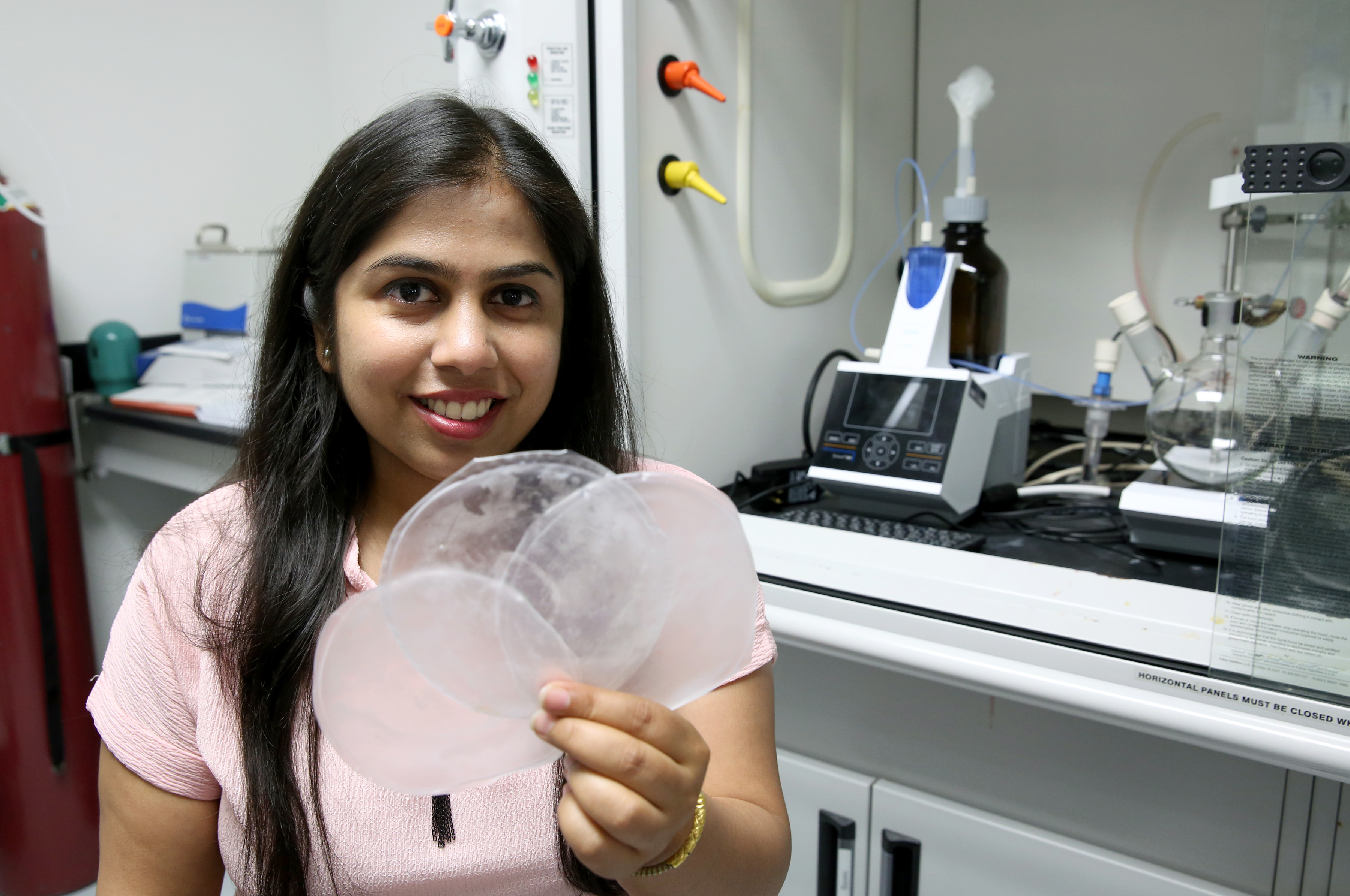 Making the antimicrobial packaging was a multistep process. One aspect involved creating a chemical reaction to load antimicrobial agents into nanoparticles. The modified nanoparticles, in powder form, then were dissolved in water at a high temperature with corn starch to make the biodegradable film.