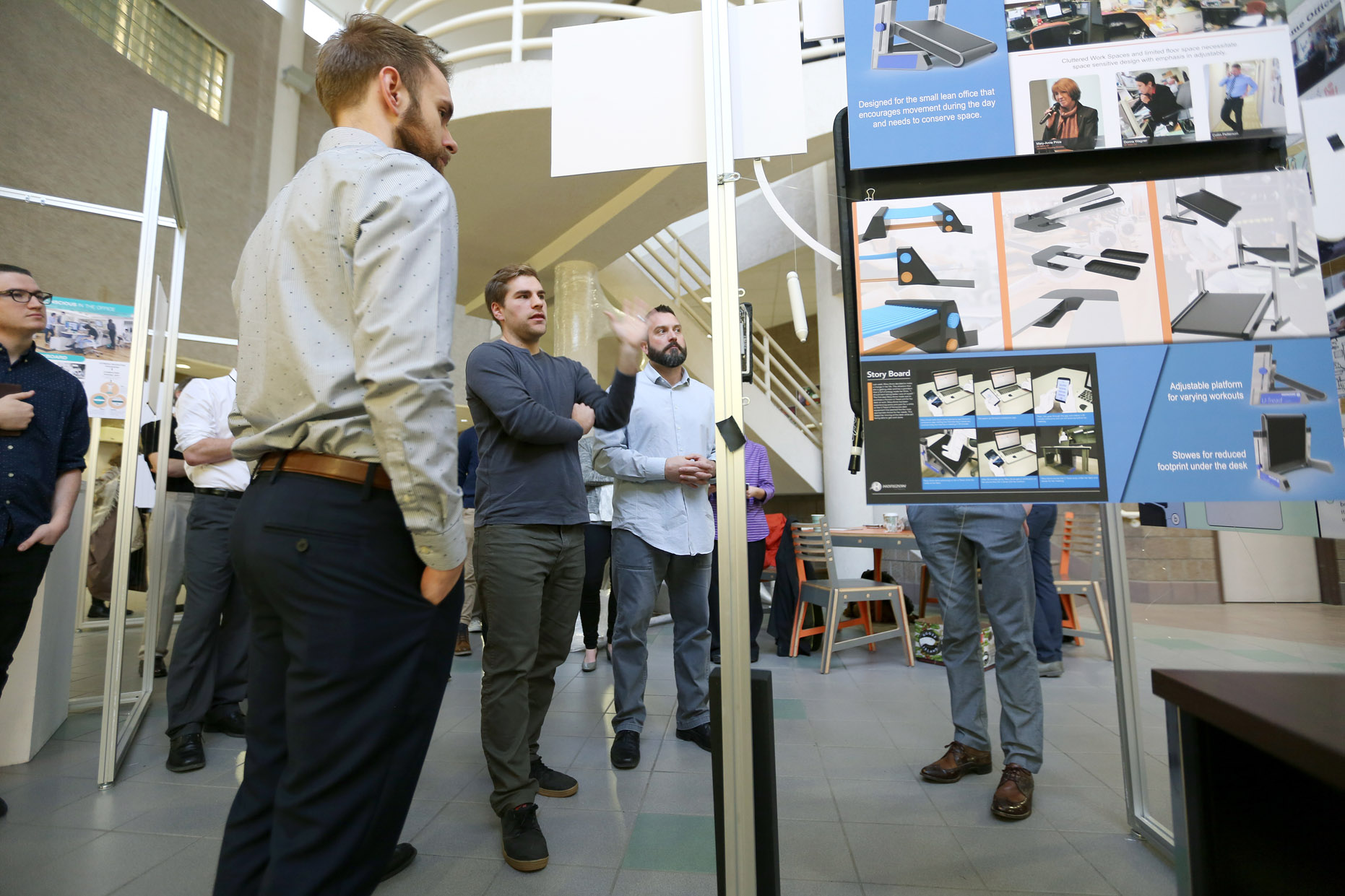 Kyle Neuser, center, motioning, and Ryan Crist, right, from Johnson Health Tech of Cottage Grove review new fitness product ideas created by UW-Stout industrial design students.