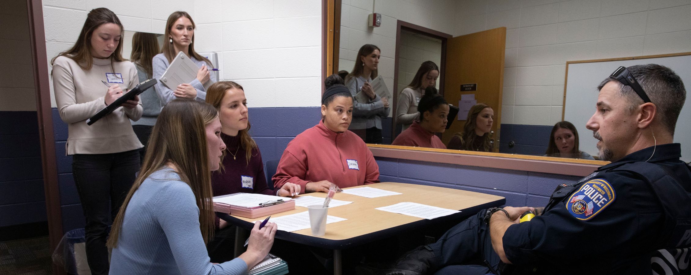 UW-Whitewater Police Officer Dan Kuehl, left, demonstrates roadside testing of drivers who are suspected of operating while intoxicated. Students in Criminal Justice 325 (forensic documentation) with Lecturer Pete Killoran began in the classroom on Wednesday, Nov. 20, 2019, with instruction from Kuehl and then went outdoors to analyze a simulated drunken driving crash scene organized by Killoran