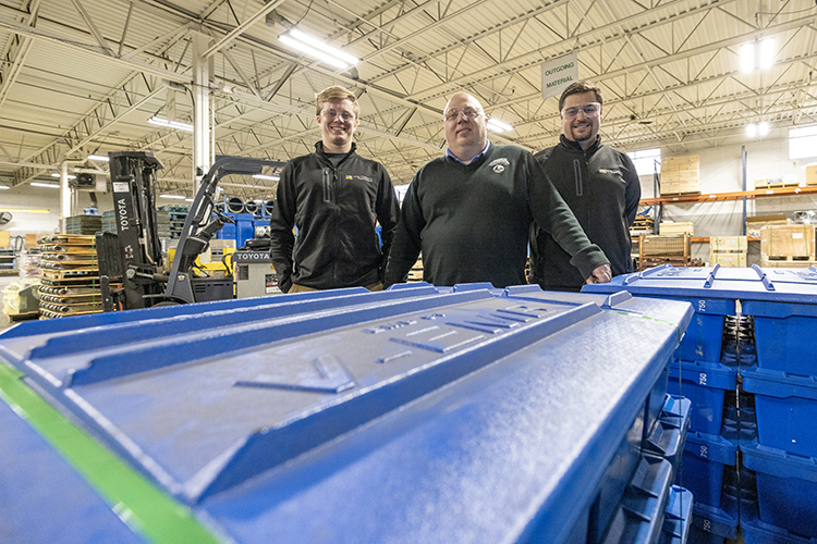 Easton Dobson (left) and Colin Haagensen flank Steve Coolidge, general manager of AAA Sales & Engineering on the floor of the company’s Oak Creek plant. Dobson, Haagensen and another student, Ryan O’Day, worked on a project that benefited the company and gave the students real-world experience. (UWM Photo/Troye Fox)