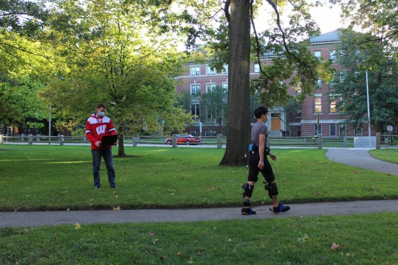 A study participant wears the exosuit and tensiometer while walking outside. PHOTO BY HARVARD BIODESIGN LAB