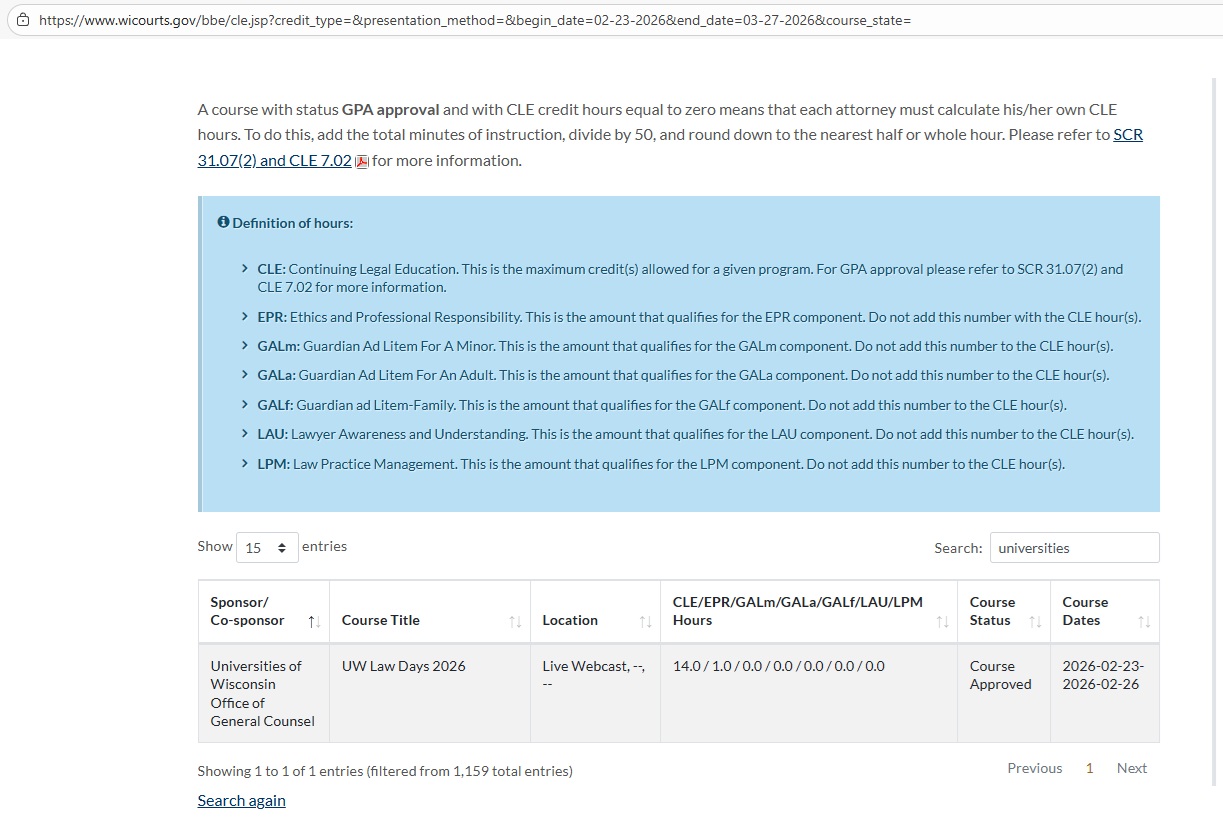 UW Law Days 2024 was approved for 15 CLE credits (for attorneys) by the Wisconsin Board of Bar Examiners.