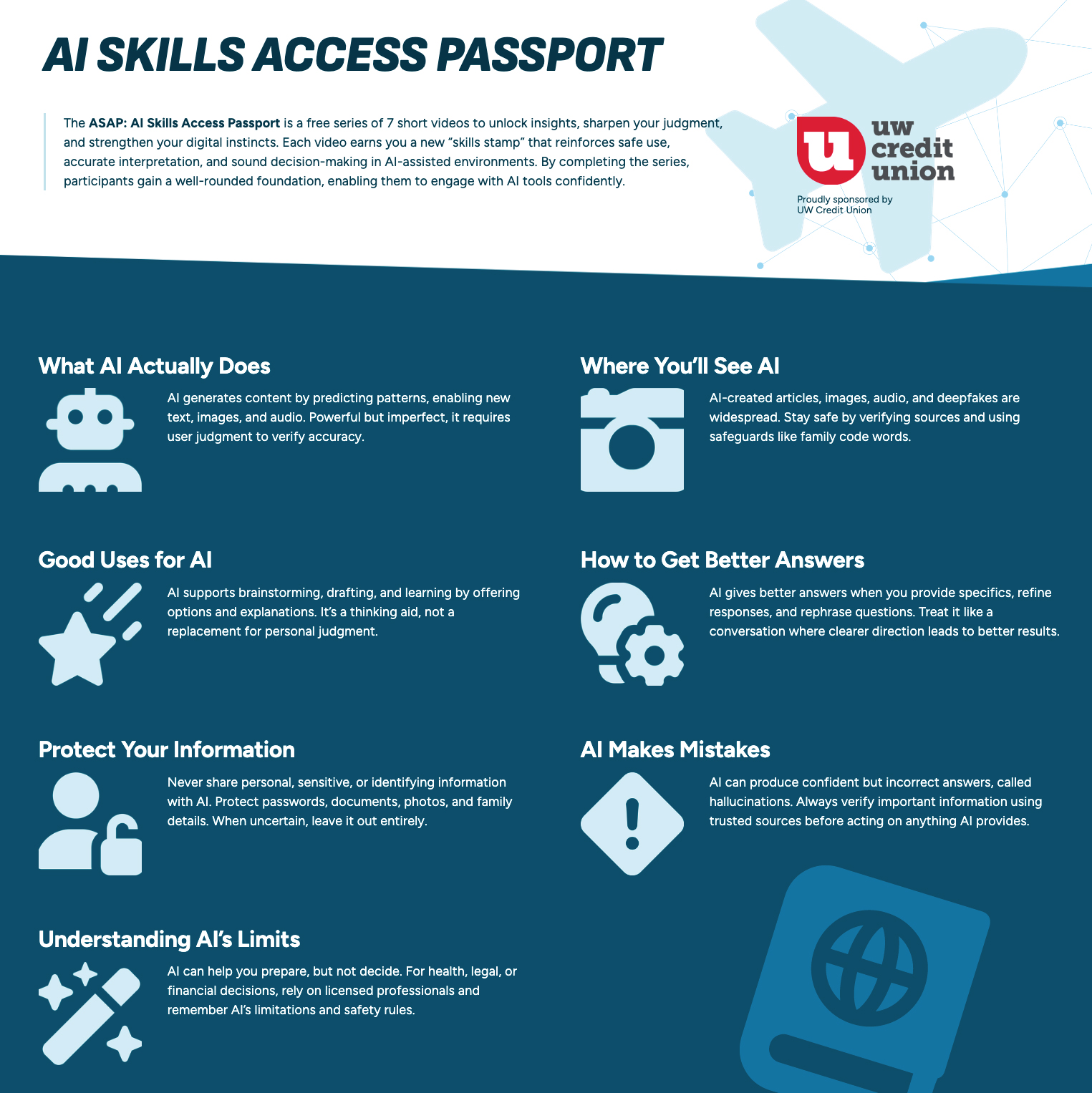 “UW Credit Union’s commitment to building economic mobility extends well beyond financial services,” said Director of Financial Inclusion & Community Engagement at UWCU, Steph Harrill Kyle. “As a strategic partner to the Universities of Wisconsin, we share the goal of building informed, capable, and empowered communities throughout Wisconsin. This free educational resource is for anyone looking to understand how AI works, so that if they choose to use it, they can do so safely and with confidence.”